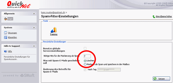 þ Mit “Nötige Hits für die Markierung als Spam” kann die Empfindlichkeit des Spamfilters eingestellt werden (1 stark empfindlich bis 7 schwach). Mit einer stärkeren Empfindlichkeit des Spamfilters steigern Sie auch das Risiko, ein erwünschtes E-Mail zu löschen.